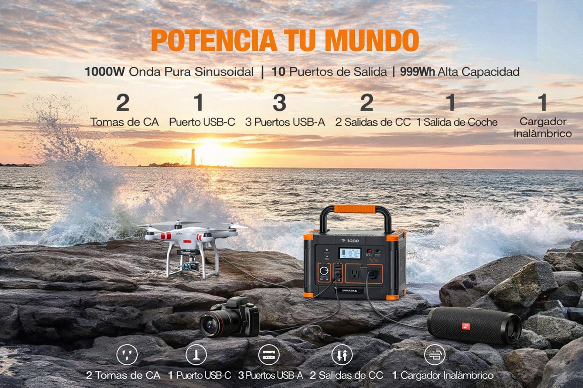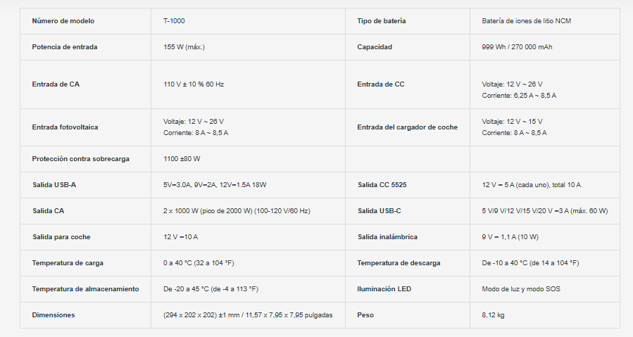 La estación de energía de 1000 W cuenta con carga inalámbrica en un segundo, lo que permite cargar tus dispositivos de forma rápida y cómoda sin cables. Además, incluye una versátil luz LED con modos brillante, SOS y linterna, lo que garantiza visibilidad y seguridad durante acampadas, cortes de luz o emergencias.
