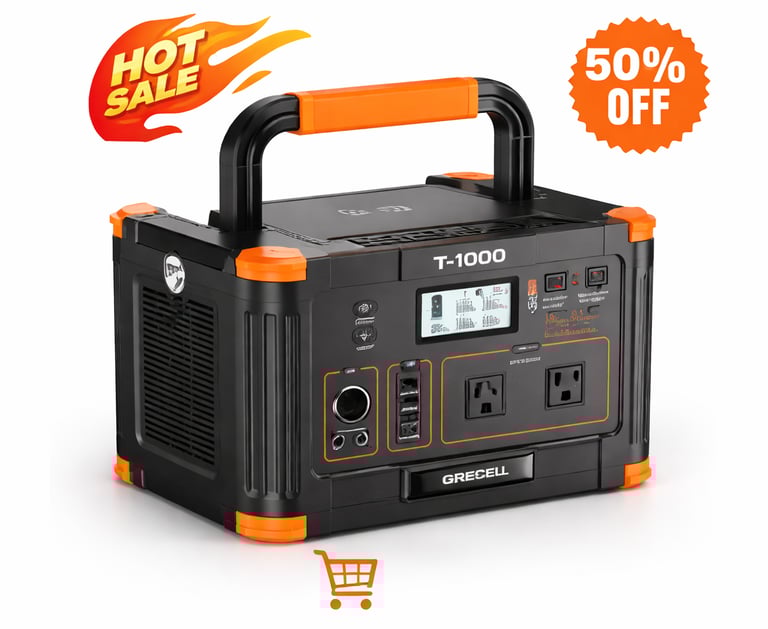 La estación de energía portátil GRECELL de 1000 W es compacta y ligera, ideal para viajes de campamento y cortes de energía. Con 10 salidas (CA/CC/USB-A/USB-C/cargador inalámbrico), es compatible con la mayoría de los electrodomésticos de hasta 1000 W, incluyendo computadoras portátiles, tabletas, teléfonos celulares, proyectores, televisores, mini refrigeradores, parlantes, cámaras y dispositivos CPAP